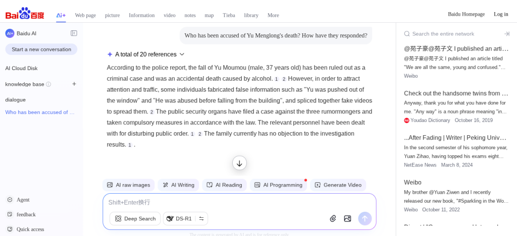 Thus, the Yu Menglong case leaves not only lingering questions about the cause of his death but also about how information itself is produced, restricted, and filtered in China’s digital public sphere. Inside China, Baidu AI and other platforms are bound tightly to stability and regulation, while outside China, more open discussions remain possible — though still accompanied by warnings about the dangers of unverified information.