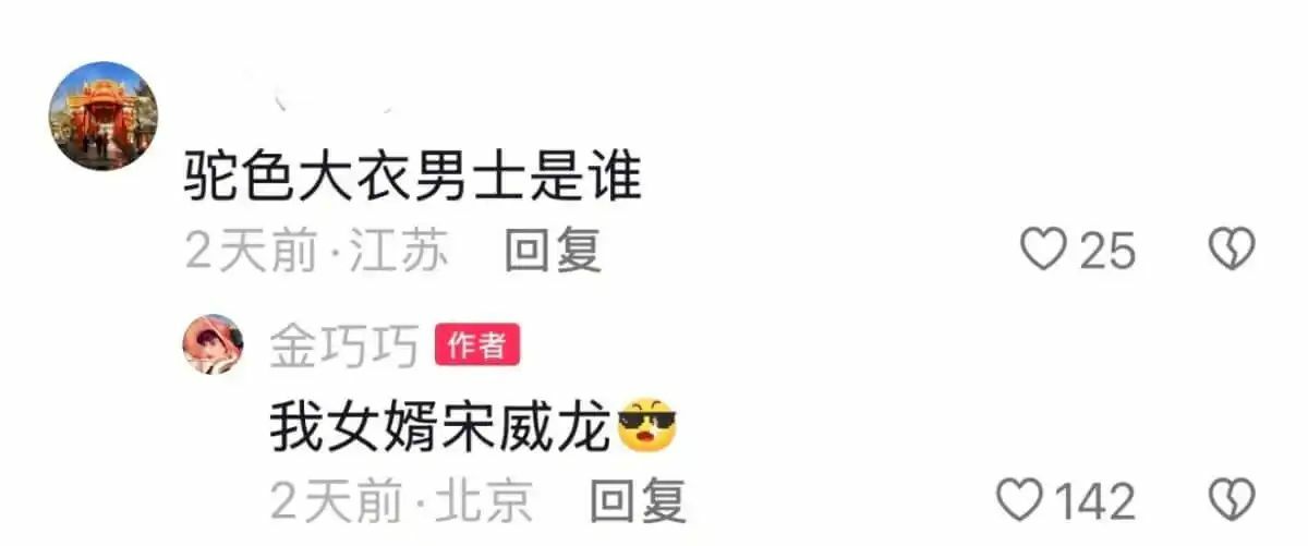 When a netizen asked about the identity of the man wearing a brown coat in one of the photos, Jin Qiaoqiao replied casually by calling Song Weilong her “son-in-law.” The response quickly filled the comment section with amused reactions, with many fans saying the actress had fully carried her role into the drama’s promotional moments.