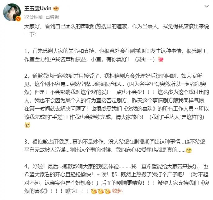 Later that afternoon, Wang Yuwen personally shared a lengthy statement on social media. She began by thanking the public for their concern and support, while admitting that she was surprised the incident occurred during the drama’s broadcast period. She also expressed gratitude to her studio team, whom she said had worked hard to safeguard her reputation and rights.