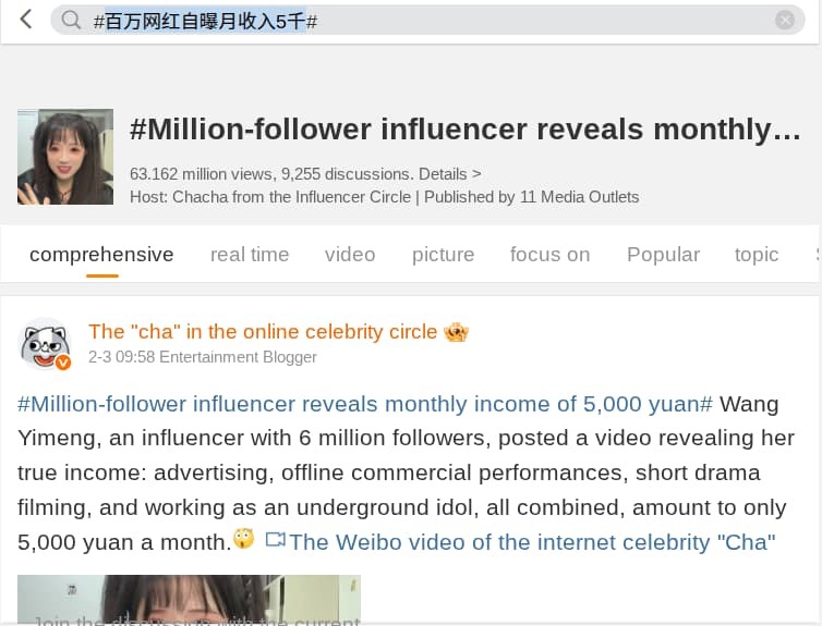 Wang stated that her combined income from advertising, commercial appearances, short drama projects, and stage performances now totals around 5,000 yuan per month (USD 700). In some months, her actual take-home pay falls below 3,000 yuan (around USD 420).