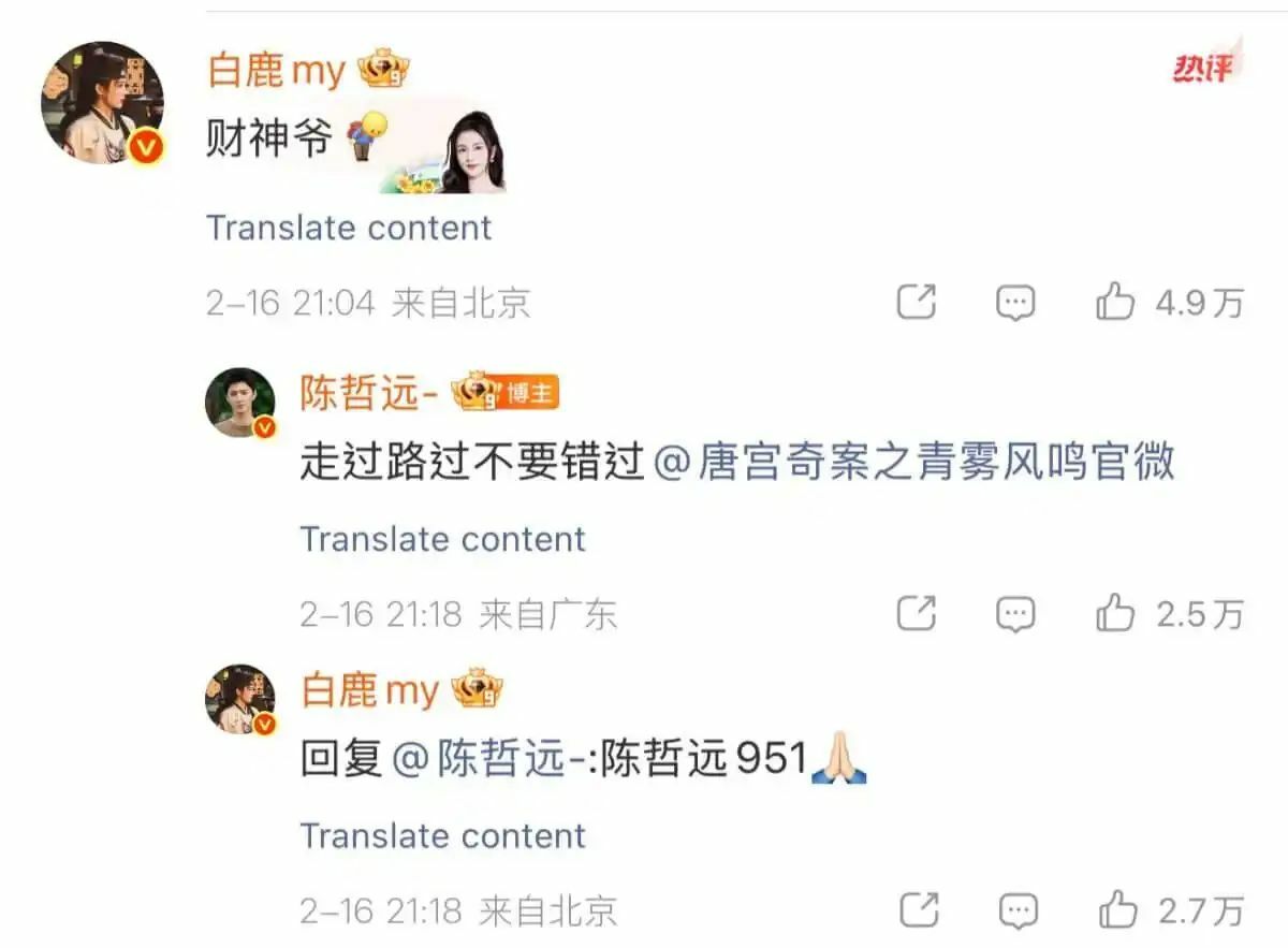 His gesture quickly drew attention from fellow stars. Bai Lu stopped by the comment section and praised him as the “God of Wealth.” Chen responded by helping promote Bai Lu’s latest drama, turning the interaction into a playful and friendly exchange.