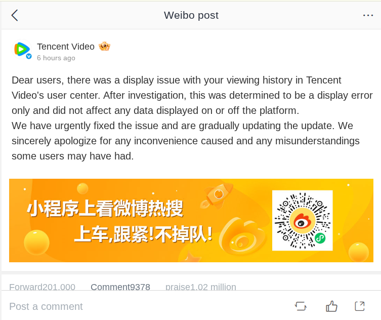 Tencent Video added that the issue had been urgently fixed and that updates were being rolled out gradually. The platform also apologized for any inconvenience and misunderstandings caused by the problem.