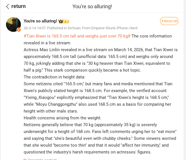 However, the information about her height also sparked some debate online. While several hashtags that trended on Weibo listed Tian Xiwei’s height as 165.5 cm, some fans and media accounts claimed that the actress’s publicly known height is actually around 168 to 168.5 cm.