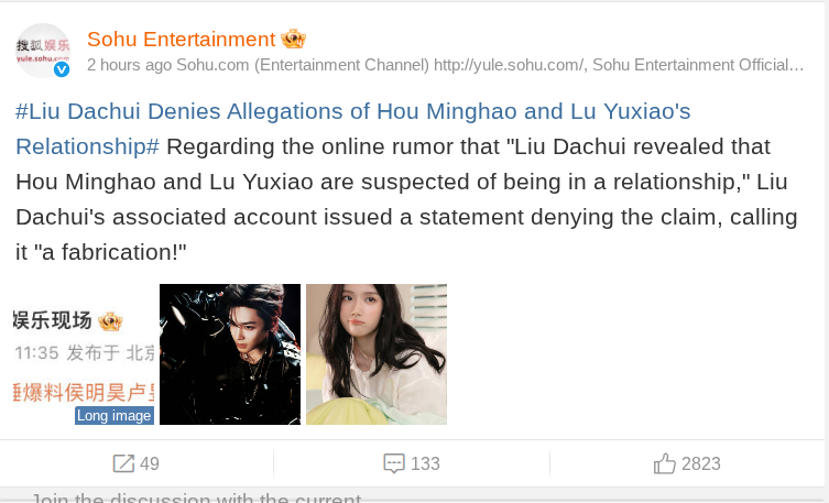 However, the claim was quickly denied. According to Sohu Entertainment, Liu Dachui’s team released an official statement rejecting the rumor and stressing that it did not originate from them.