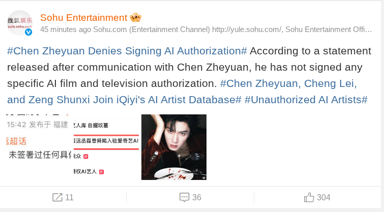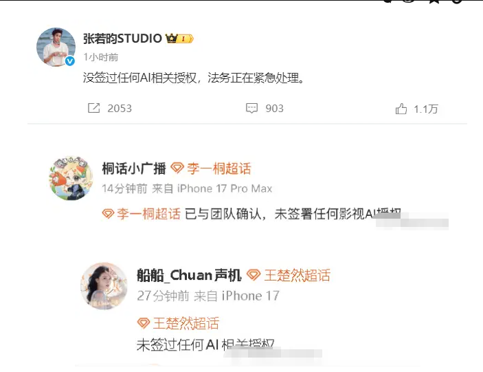 Chen Zheyuan’s team was among the first to issue a clarification, followed by similar statements from representatives of Zhang Ruoyun, Wang Churan, and Li Yitong, all stressing that no authorization had ever been given for the use of their identities in any AI system.