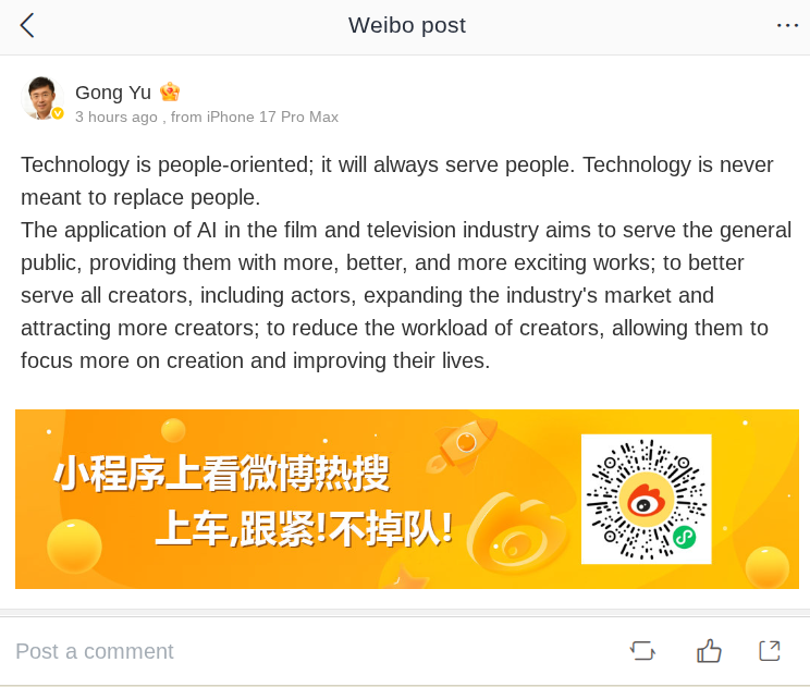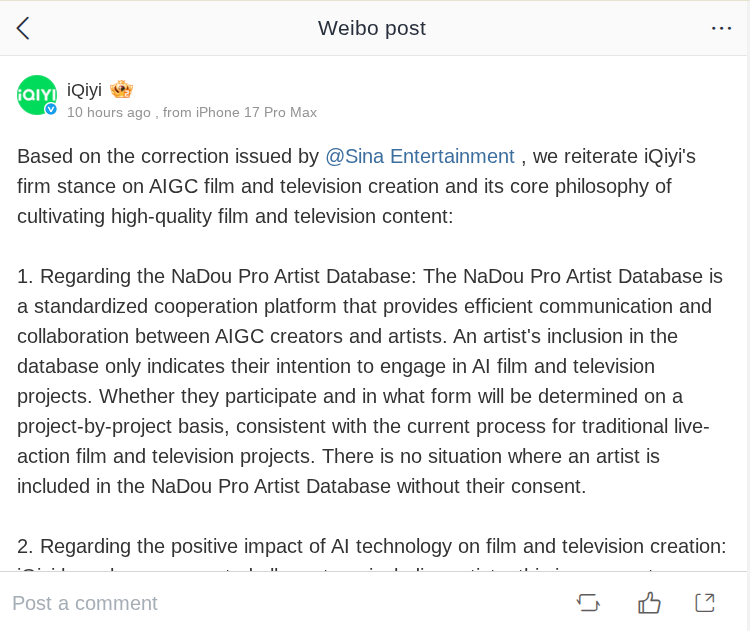 Beyond the clarification, iQIYI reiterated that its use of AI is intended to support, not replace, human creativity. The technology is positioned as a tool to lower production barriers and expand opportunities for creators.