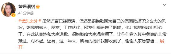 She added, “Over the past year, I have received all the criticism. Thank you to everyone who has been willing to push me to grow. I will seriously correct my mistakes and make up for my shortcomings. I have also received all the kindness, and I will work hard to become someone worthy of your trust.”
